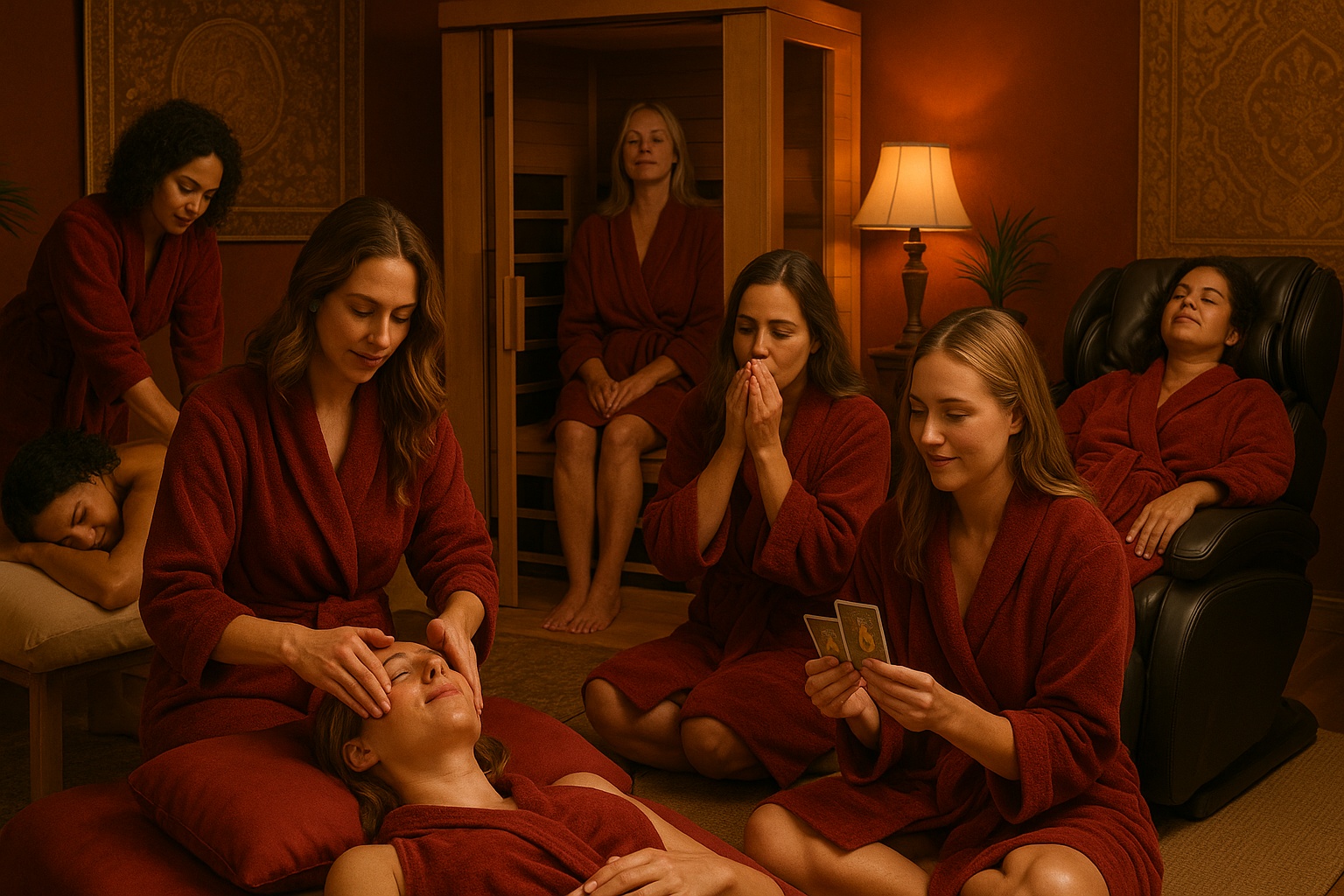 An array of party enhancements is available by request and can be added per group or per guest when you reserve your Sanctuary Soirée or Fairy Glow Party. Offerings may include favorites such as mini facials, tarot readings, crystal bowl sound bath, wood-burning sauna sessions, or scratch therapy.